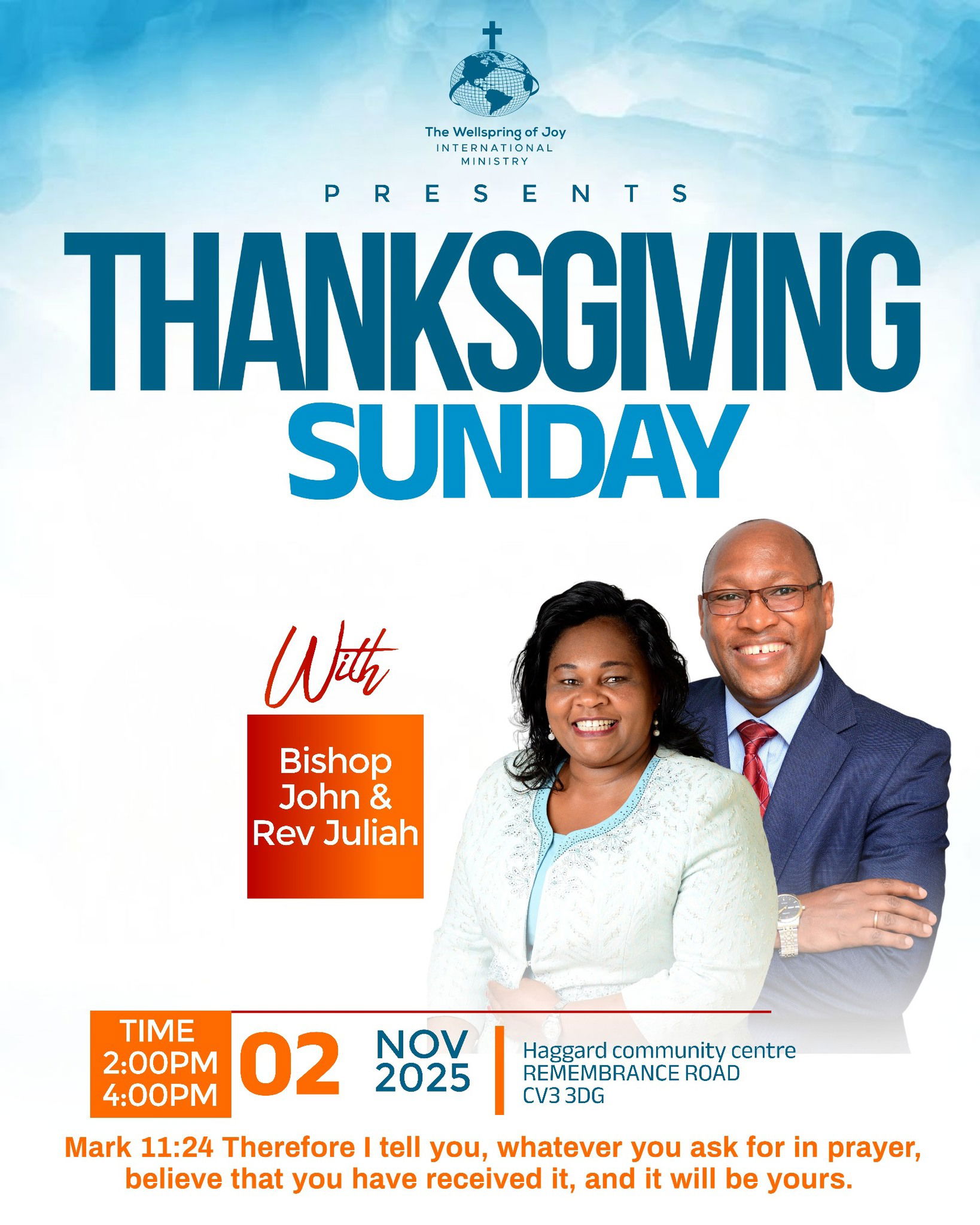 Wellspring of Joy International Ministry warmly invites the church family and friends to a special Thanksgiving Sunday, a dedicated time to pause, reflect, and give thanks to God for His faithfulness, provision, and unfailing love.